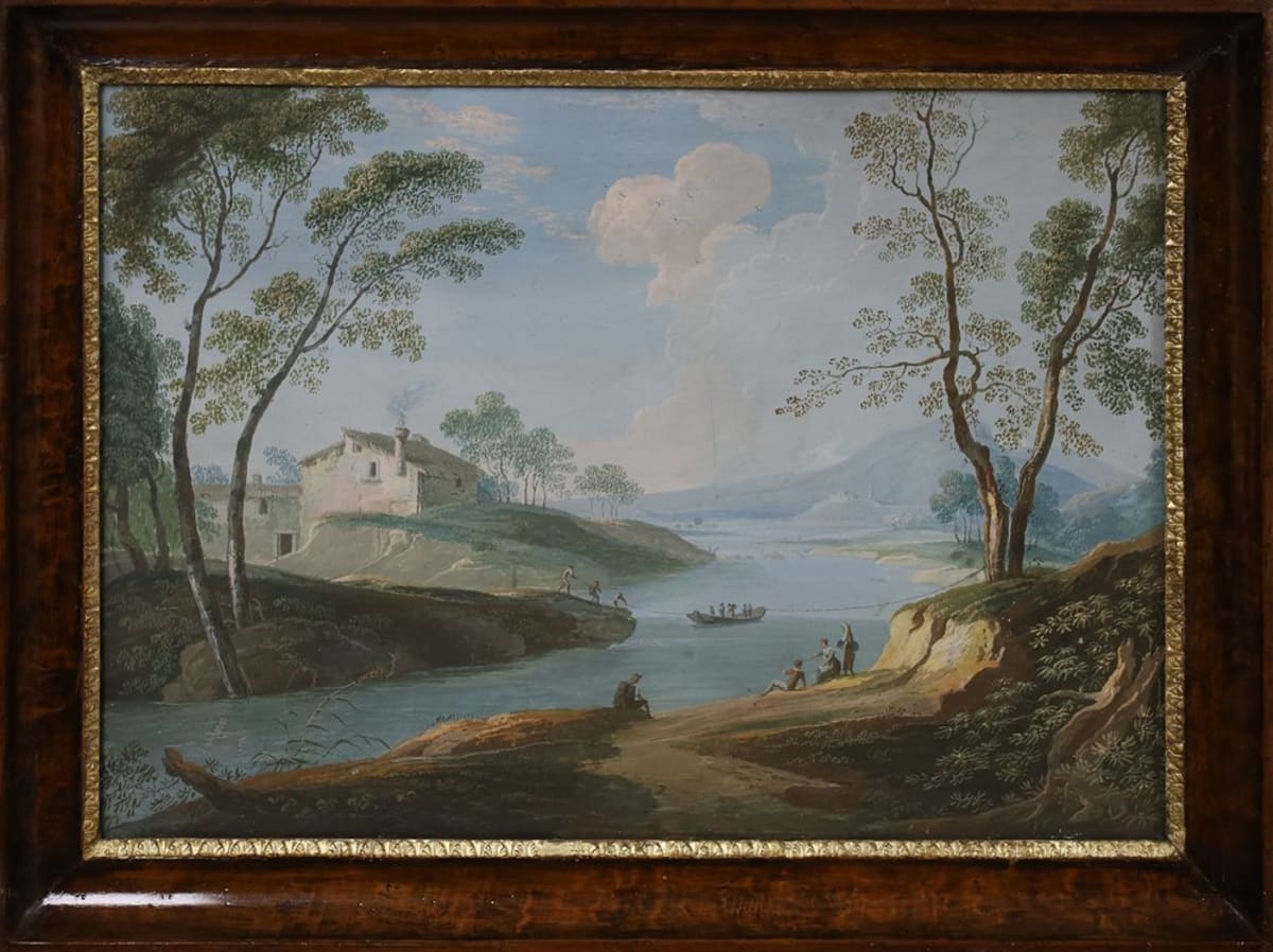 Il paesaggio in esame trova interessanti analogie di stile con la produzione di Vincenzo Martinelli Bologna 1737-1807, protagonista del 'temperismo bolognese' e dedito principalmente a descrivere paesaggi dal carattere bucolico e arcadico. Per questo motivo il nostro dipinto si puo' ricondurre alla scuola emiliana, ad un maestro decoratore, sulla scia del Martinelli, del Barozzi e del Fantuzzi.