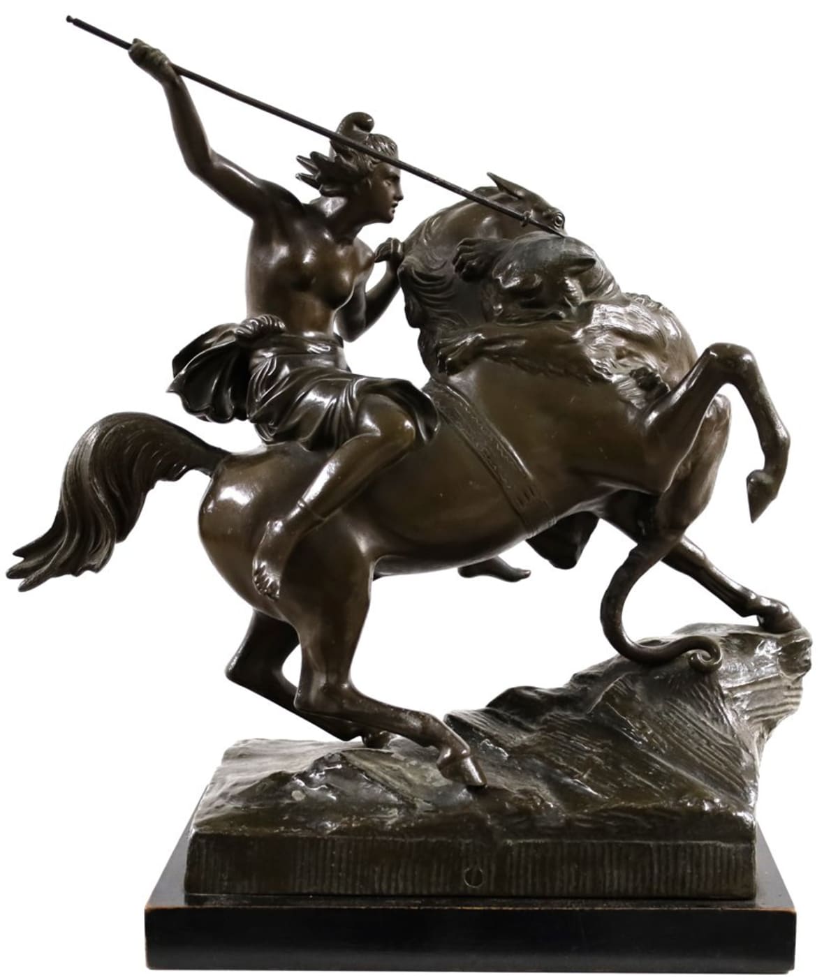 Scultura in lega a simulare il bronzo a tutto tondo raffigurante una amazzone a cavallo con la lancia in mano in atto di colpire un leone. Base in marmo. Francia, XIX secolo